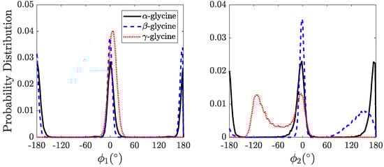 Distributions of angles for - and -glycine crystals can be seen to peak at around 0° and 180°, whereas there is a single peak around 0° for -glycine, which is consistent with the experimental structures. The distinction between - and -glycine structures is visible when the distribution of is observed. Distribution of angles peaks at around 0° and 180° for -glycine, which shows that molecules are packed in -glycine such that their CA-N axes are aligned parallel and anti-parallel to each other. On the other hand, for -glycine, the angle mainly peaks at around 0°, with an additional wider and shorter peak around ∼150°. Although the molecules are packed similarly in - and -glycine crystals, a slight difference can be observed in the distribution of , which shows that relative orientations of the molecules in -glycine fluctuate more freely compared to those in the -glycine. The peak at around −120° for -glycine is consistent with the experimentally observed helical chain structure around a three-fold screw axis [33].