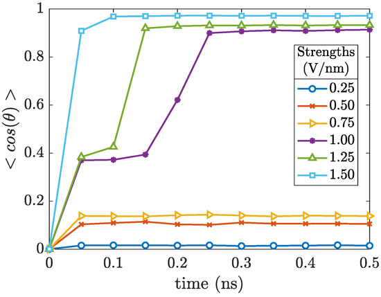 Alignment of the molecules within the crystal with the direction of the electric field can be quantified by calculating , cosine of the angle between the dipole moments of the molecules and the direction of the electric field () averaged over the number of molecules in the crystal. Equation (2) was used to calculate the dipole moment of a single molecule: