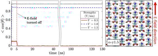 As mentioned in Section 1, it is expected that the solid-state crystals of the new polymorphs obtained upon application of e-field will not undergo a transition after the e-field is turned off, as opposed to the nanocrystals in solution reported in [17], since there are no high-energy surface molecules. To test whether or not the new polymorphs will sustain their structures after the e-field is turned off, the crystals obtained after the application of e-field were simulated for an additional 125 ns without an e-field. Figure 6 shows the against time during and after the application of an e-field with different strengths on an initially -glycine crystal. For the high-intensity cases ( V/nm and V/nm), it can be observed that no change in the alignment of molecules with the direction of the e-field took place even 125 ns after the e-field had been turned off, which is 25 times the duration of the e-field application. This shows that the e-field caused a solid-state transformation that led to metastable new crystal structures when applied to solid single crystals of glycine, whereas glycine nanocrystals in solution subjected to e-field were reported to lose their structure within 5 ns after the field had been turned off [17]. With the absence of highly mobile surface molecules in the solid-state, there exists a high kinetic barrier for a subsequent change in structure. In the case of V/nm, on the other hand, a slight increase in () is observed upon application of e-field, which rapidly goes back to zero after the e-field is turned off. As discussed earlier, the change in does not correspond to a transformation in the crystal structure, but is attributed to the favored fluctuations of the molecules toward the direction of the e-field. Thus, quickly goes back to zero when the e-field is turned off.