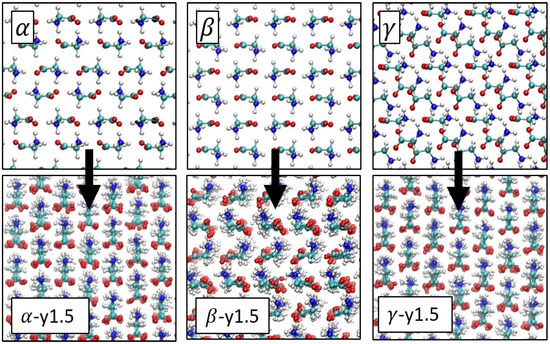 It can be observed that -y1.5 has higher potential energy and enthalpy values compared to the known -glycine structure. Although this is not a sufficient measure to make conclusions about the relative stability of the new polymorph, since the simulations are done at 298 K, it is still worth mentioning that this new polymorph is energetically less favorable than its precursor. However, -y1.5, -y1.5, and -y2.0 have energies that are comparable, if not slightly lower, compared to their precursors. This shows that the molecules are packed efficiently in this new structure with complete alignment, and no unrealistic bonds with high energy are present. Moreover, enthalpies of -y1.5, -y2.0, and -y1.5 were found to be comparable with each other, but significantly lower compared to the enthalpy of -y1.5. The same trend can be observed when the density and specific volume values are examined. It is interesting to note that densities of the new -y1.5, -y2.0, and -y1.5 crystals are higher compared to the densities of - and -glycine crystals, which shows that the molecules are more densely packed in this new crystal structure. The -y1.5 crystal, on the other hand, has a much lower density, both compared to the initial -glycine crystal and -y1.5 and -y1.5 crystals.
