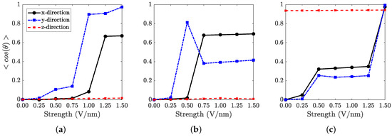 The time averages of values of molecules in initially -, -, and -glycine crystals are plotted against the e-field strengths in Figure 9. It can clearly be seen that the alignment of the molecules with the e-field increases as the strength of the e-field increases. This is expected, since the increased strength of the e-field results in a bigger contribution to the Hamiltonian, enabling the system to overcome higher energy barriers that lead to new conformations with better alignment. This hypothesis is further supported by the fact that the alignment of the molecules in the resulting conformation does not change until a certain threshold in the intensity of the electric field is crossed. For instance, in Figure 9c, increases from zero to 0.25 with an intensity of 0.50 V/nm, then stays at that value for the intensities of 0.75, 1.00, and 1.25 V/nm. Only when the intensity is increased to 1.50 V/nm does the crystal take its new polymorphic form with complete alignment with the electric field. It is possible that the system is stuck at a new energy minimum between the intensities of 0.50–1.25 V/nm and manages to cross the barrier to another new conformation only when the intensity is 1.50 V/nm. One exception to the trend mentioned above is the peak that makes at V/nm for the initially -glycine crystal. It is possible that the strong e-fields (0.75 V/nm and above) force the molecules to rotate rapidly into a new, high-energy structure, where the crystal gets stuck at a new potential energy basin. On the other hand, lower-strength (V = 0.5 V/nm) e-fields are not strong enough to facilitate the transition into the same high-energy structure, but strong enough to initiate a slower transition into a different, lower-energy structure. The potential energies of -y0.5 and -y0.75 were calculated as −322.2 and −317.9 kJ/mol, respectively, which supports this idea.