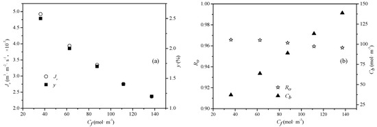 Figure 4 reflects the effect of transmembrane pressure on the RO process. According to Figure 4, within the range of experimental parameters (310 kPa < △p < 617 kPa; 36 mol·m−3 < Cf < 140 mol·m−3), when other experimental conditions are constant, Jv, y, Ro, and Cb increase with an increase in transmembrane pressure. Jv and △p are approximately linear, which is consistent with the irreversible thermodynamic Spiegler–Kedem model selected in this paper (Equation (11)). As the △p increased, y increased slowly, followed by an increase in growth rate, and the Cb maintained approximately the same trend. According to Equation (10), the recovery formula is a ratio. Combined with Figure 3 and Jv trend over △p. In the formula of y, the numerator increases linearly with △p (consistent with the trend of Jv, Equation (9)), and the denominator decreases approximately linearly with △p. Therefore, the overall ratio should increase, and the rate of the value increase should be gradual, which is consistent with the trend of y in Figure 4. According to Figure 4b, with the increase of △p, Ro is slightly improved, although the trend is not obvious. According to Figure 3, Qf decreased with increases of △p. This means that a unit volume of feed solution can acquire more pressure to facilitate the RO process. The macroscopic performance of this process was an increase in Ro and Jv.