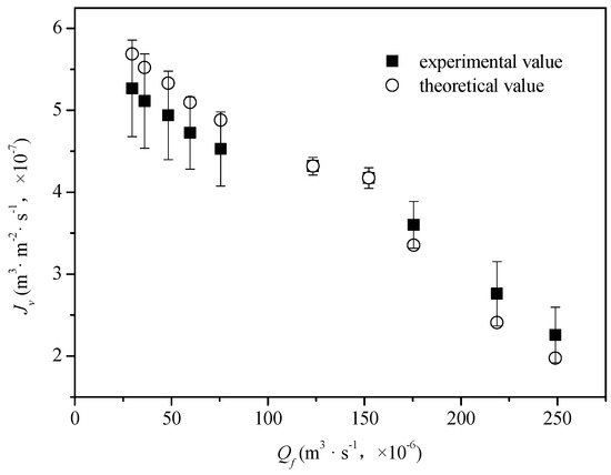 In the RO experiment, the feed solution flow Qf and the permeate flow Qp were obtained according to the flow meter. Then, the solvent (pure water) flux Jv was obtained (experimental value) based on Equation (9). Combined with Equation (21) and Table 2, we calculated the Jv (theoretical value). The comparison of the two Jv values is shown in Figure 6. Meanwhile, we calculated the relative error between each group of two Jv values, and the maximum value of the relative error was 12.81%.