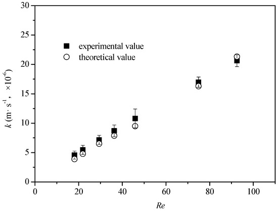 In this paper, according to Equation (29), the Reynolds number was the main factor affecting the mass transfer coefficient. Combining Table 3 and Equation (29), we plotted the experimental and theoretical values of k, as shown in Figure 7. We also calculated the relative error between each group of the two k values; the maximum value of the relative error was 12.2%.