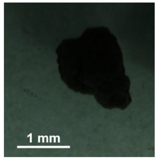 The mixture of powders was granulated using a Bindzil and water mixture in a 16 mm Thermo Fischer Twin Screw granulator. The granules were then dried and sieved. A photograph of a dried granule is presented in Figure 1. The granules of the sieve fraction, 0.7–1.0 mm, were taken and rewetted with water in a ratio of 10:7 by mass. This wet granular mixture was used to create a cylindrical pellet with a 25 mm diameter and height using a hand-press punch and die set. The dynamic-yield-strength test of the pellet was conducted using an Instron ElectroPuls E1000 mechanical testing frame. This instrument consists of two vertically aligned metallic heads facing each other. Both heads are greased with Vaseline and the pellet is placed on top of the bottom head. During equipment operation, the bottom head stays in a fixed position while the top head moves downward to impact the pellet at a preset velocity of 100 mm/s. The instrument measures the vertical force used to compress the pellet and the displacement of the upper head. After converting the force and displacement into engineering stress and engineering strain, the peak-stress value in the measurement is defined as the material’s dynamic yield strength.
