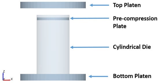 In order to make the pellet in the simulation, a hollow cylindrical die of 25 mm diameter and 40 mm height was created with both its top and bottom circular sections open. This cylinder was placed vertically over the bottom platen and was filled to a height of 29 mm with spherical particles, which were normally distributed, with a mean diameter of 0.7 mm and a standard deviation of 0.21 mm. Particle distribution was capped at 0.7 and 1.0 mm to simulate the sieve fraction from the experiment results. The spherical particles in the simulation represent an approximation to the experimental granules, which had a vertical aspect ratio of 1.30. This increase in size is a common approximation done in DEM simulations in order to reduce computational time [40]. These particles were compressed inside the die at a rate of 1.5 mm/s to a height of 22 mm using a smaller cylindrical plate of 24.6 mm diameter, and then released. This caused the pile to spring back up to an approximate height of 25 mm. The hollow cylinder was then removed to leave behind a cylindrical pellet on top of the bottom platen.