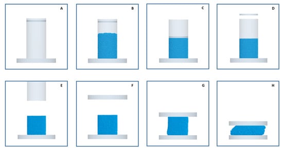 The results from the DYS simulation are visualized in Figure 4. An empty cylinder was laid on top of the bottom platen (A) and filled with particles (B). The smaller precompression plate moved downward to compress the pile (C). Next, the precompression plate was withdrawn (D). The hollow cylinder was removed to expose the compressed pile (E). Finally, the top platen moved downward at the specified speed (F–H). The state of the pile just after the top platen hit it is shown in (G), while (H) shows the final state of the pile. Note that the base-case DYS simulation had a time step of s and took 10 h to complete using 12 cores of Intel Xeon (R) E5-2650 v4 CPU @ 2.2 GHz.