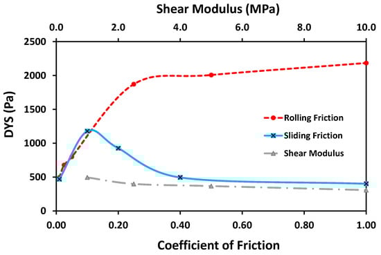 Based on the above results, it was decided that more detailed analysis was necessary to obtain a better idea about the influence of the more sensitive parameters (i.e., the coefficient of rolling friction, the coefficient of sliding friction, shear modulus, and surface energy) on DYS values. Hence, simulations were run with friction parameters varying in the range of 0.01 to 1; the shear modulus varied between 1 to 10 MPa, and surface energy varied from 0.45 to 2.7. Note that the results of the sensitivity of the DYS value to surface energy are presented later as part of the calibration study in Section 4.3. Results from the detailed sensitivity analysis of the remaining three parameters are plotted in Figure 5. The plot shows that the effect of the shear modulus on DYS was the least among the three parameters. The DYS result rose sharply with increasing CoRF up to a value of 0.30, after which its influence waned significantly. The impact of the CoSF was strongest, in the range from 0.01 to 0.40. The DYS value peaked at a CoSF of 0.1, while values on either side of this number seemed to decrease frictional resistance to the deformation force in the DEM simulations, leading to a lower value of DYS.