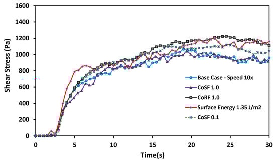 Even with the faster plate speed, the shear-cell simulations took significantly longer to run than the DYS simulations. The base-case simulation of 30 s took 40 h to complete using 12 cores of Intel Xeon (R) E5-2650 v4 CPU @ 2.2 GHz. Hence, the sensitivity study of the shear cell is less extensive compared to the DYS study. Only parameters identified as the most sensitive in the DYS study were tested. In this study, four additional simulations were executed by individually varying one parameter at a time. These simulations included runs with: surface energy set to 1.35 (three times the value of the base case); a CoRF set to a high value of 1.0; a CoSF set to a high value of 1.0; and a CoSF set to a value of 0.1. The results from these simulations were compared to the base-case simulation in Figure 7. The plot suggests that increasing the sliding-friction value from 0.40 (base case) to 1.0 had no significant effect on critical-state shear value. Setting the CoSF value to 0.1 increased the critical-state shear value, i.e., the CoSF showed similar behavior to those observed in the DYS sensitivity study. When the coefficient of rolling friction value was changed to 1.0 from 0.01 in the base case, the critical-state value increased from 1008 to 1183 Pa in the base case. The final simulation in the study showed that the shear-cell simulation is also affected by the surface-energy parameter, but it appears that the shear cell is not as sensitive to the parameter as was the case in the DYS simulations. It can be inferred from these results, the shear-cell simulation cannot decouple the effects of the surface-energy parameter from the effects of CoSF and CoRF when the JKR contact model is used. Hence, the shear-cell model cannot be independently used to calibrate the friction coefficients of cohesive particles before running the DYS model to calibrate surface energy.