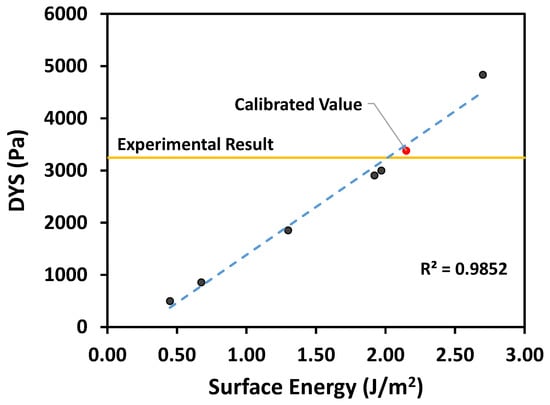 The DYS calibration study was conducted to test whether the cohesion parameter could be calibrated by matching the simulation DYS results to the experimental DYS result of 3242 Pa. Since the shear-cell simulation could not be used to calibrate the sliding- and rolling-friction parameters, the study was carried out by fixing the values of CoSF, CoRF, and shear modulus to the base-case simulation values. In this study, surface energy was varied in an attempt to match the experimental DYS result. A total of seven simulations (including the simulations performed for sensitivity analysis) were carried out at the following surface energies: 0.45, 0.675, 1.125, 1.92, 1.97, 2.15, and 2.70 . The DYS results from these simulations are plotted against the surface energy used in the simulations in Figure 8. From the plot, it is clear that the DYS value has a linear relationship with surface energy. This relationship is expressed by the following equation: DYS (Pa) = 1837 × Surface Energy() − 456. This line, shown in the plot, has an R value of 0.9852, indicating that it is a very good fit. From the plot, it can also be seen that the simulation with surface energy of 2.15 had a DYS value of 3378 Pa, which closely matched with the experimental value of 3242 Pa. In fact, this simulation result is within 5% of the experiment result.