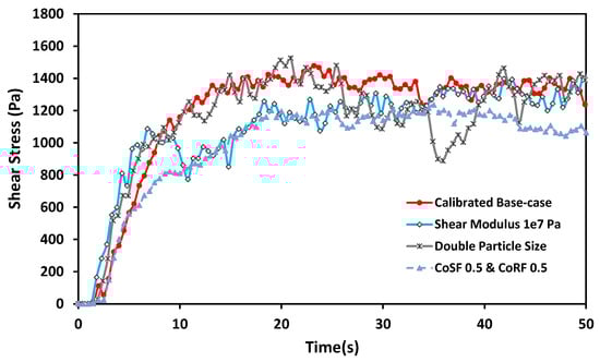To verify the validity of the calibrated surface energies, the parameters used by simulations mentioned in Table 5 were tested using the shear-cell simulation in this study. Results plotted in Figure 9 show that the CBC simulation had a critical-state shear value of about 1330 Pa. The simulation with the doubled particle size had a critical-state shear value close to that of the CBC simulation, albeit with larger fluctuations. This implies that the calibration of the scaled-up particles did not result in changes to the particle flow. It further demonstrates the robustness of the method of calibrating surface energy using DYS simulations. Figure 9 also showed that calibrated surface energy for the higher shear-modulus simulation did not have a significant impact on the critical-state shear result. Finally, the simulation with higher friction parameters had a different critical-state shear value (1178 Pa) compared to the CBC simulation. This was to be expected since the shear-cell results were shown to be sensitive to the friction coefficients even though the model could not differentiate the effects of CoRF, CoSF, and surface energy.