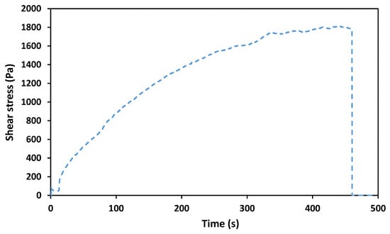 The wet mixture was added to the trough of a Dietmar-Schultze Ring Shear Tester. Preconsolidation normal stress of 2000 Pa was applied through the lid of the shear cell, and the rotation rate of the base was set to 0.026 rad/min. Changes in shear value over time were recorded by the instrument. After the shear value reached a steady state, the load was reduced to zero.