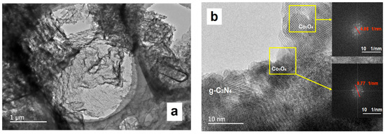 (a) TEM image of CNNS and (b) TEM image and selected area electron diffraction (SAED) analysis of 12Co3O4/CNNS.