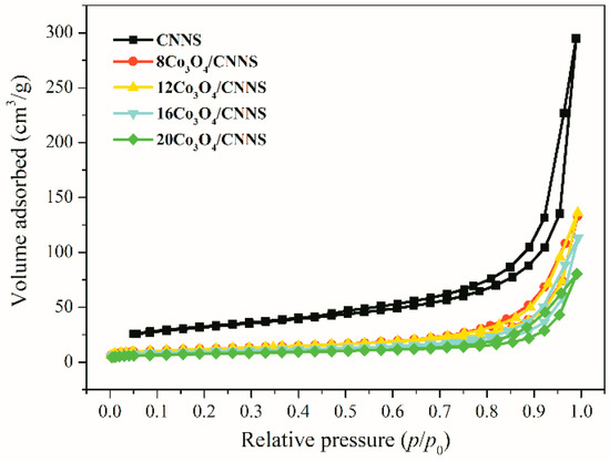 The nitrogen isotherms of the pure and Co3O4-modified CNNS are presented in Figure 5. Hysteresis loops were observed in all specimens at higher relative pressure. The nitrogen uptakes at lower relative pressures were fairly less, implying that enormous mesoporous structures presented on the catalyst surface [29]. The pure CNNS had a large BET surface area of 109 m2/g and large average pore size of 19 nm (Table 1). After incorporating Co3O4, they all reduced significantly. The BET surface area and average pore size of xCo3O4/CNNS dropped to 27–42 m2/g and 10–12 nm, respectively. The probable reason for this is that parts of the mesoporous structures of the CNNS were filled or blocked by Co3O4 grains [30].