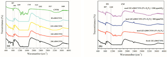 FTIR profiles: (a) fresh CNNS and xCo3O4/CNNS; (b) fresh and spent 12Co3O4/CNNS.
