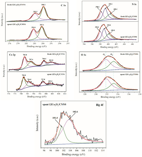 The surface elemental valences of 12Co3O4/CNNS before and after reaction were examined by XPS, as presented in Figure 7. The bands at ~284.6 and ~285.2 eV relate to the sp2-bonded carbon atoms, while the peaks at ~287.6 and ~288.2 eV are associated with the N–C=N structures [36]. The peaks at ~398.0 and ~398.4 eV belong to the hybridized secondary nitrogen (C–N=C). The bands at ~399.0 and ~399.2 eV are related to the hybridized tertiary nitrogen (N–(C)3). The peaks at ~400.0 and ~400.4 eV correspond to the –NH2 groups [37]. What is more, the C 1s and N 1s binding energies of the used 12Co3O4/CNNS are smaller than those of the fresh one. This suggests that Hg0 probably donates electrons to g-C3N4 during mercury removal reactions. With respect to the Co 2p spectrum, the bands at ~782.0 and ~782.8 eV are supposed to be the reflection of the Co3+ in the Co3O4, while the peaks at ~786.4 and ~787.4 eV relate to the signals of the Co2+ in the Co3O4 [38]. The ratio of Co3+/Co2+ for the fresh specimen is ~0.83. It slightly decreases to ~0.75 for the spent specimen. This indicates that a fraction of the Co3+ cations transferred into the Co2+ cations after Hg0 oxidation. The Co3+ cations are involved in the mercury oxidation reactions. The bands at ~531.8 eV belong to the chemisorbed oxygen (Oα) on the catalyst exterior, while the peaks at ~533.2 eV are linked to the oxygen (Oβ) in the –OH group or C–O bond [39]. The percentage of the chemisorbed oxygen increased from ~54.7 to ~61.3% for the 12Co3O4/CNNS before and after the reaction, correspondingly, which infers that the gaseous O2 from the feed gas may replenish the depleted chemisorbed oxygen during the Hg0 oxidation processes. The Hg 4f spectra displays two feature peaks at ~101.4 and ~103.6 eV, which implies the generation of HgO [40]. Moreover, the absence of the feature peak of elemental mercury at 99.9 eV indicates that Hg0 adsorption over 12Co3O4/CNNS is governed by chemisorptions [41].