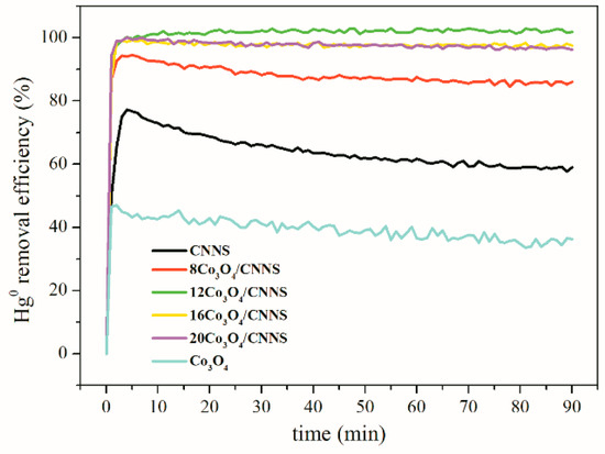 The performances of the pure and Co3O4-modified CNNS with respect to elemental mercury removal at 120 °C in 5% O2/N2 over 90 min are presented in Figure 8. The pristine CNNS shows good Hg0 capture ability, plausibly because of the distinct C–N structure and considerable surface area. The equilibrium Hg0 removal efficiency is ~59.0%. Incorporating Co3O4 with g-C3N4 could remarkably enhance the Hg0 removal ability. The Hg0 sorption rate at the initial stage and the Hg0 removal efficiency both increase after the addition of Co3O4. The mercury conversion rises from ~59.0 to ~86.0% as the Co3O4 loading value elevates from 0 to 8 wt%. The 12Co3O4/CNNS performs the best with mercury conversion reaching ~100%, indicating that the Co3O4 modification contributes to Hg0 removal by the introduction of added reactive sites. Moreover, the tight interfacial interaction of Co3O4 and g-C3N4, with promoted charge transfer mobility, can facilitate redox reactions, which could enhance mercury conversion. Nevertheless, the redox ability would decline with further incremental Co3O4 content. The mercury conversion subtly drops to ~97.5% when loading value exceeds 12 wt%, presumably owing to the significant reduction of the surface area. Thus, the best Co3O4 content for xCo3O4/CNNS is 12 wt%. What is more, bare Co3O4 exhibits a poor performance towards mercury adsorption with a mercury conversion of only ~36.3%, probably owing to its larger grain size and lower surface area. Thus, it can be concluded that Co3O4 and g-C3N4 display a cooperative effect towards Hg0 removal.
