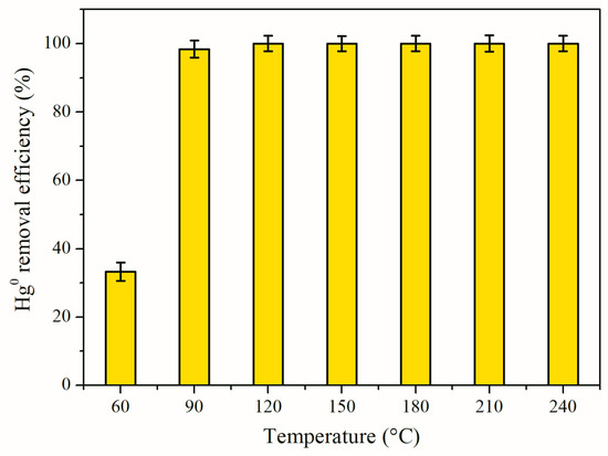The mercury conversion of the 12Co3O4/CNNS at 60–240 °C in 5% O2/N2 is presented in Figure 9. It is found that temperature could significantly affect mercury removal performance. Fairly low mercury oxidation activity was exhibited at 60 °C by 12Co3O4/CNNS, with a mercury conversion of only ~33.3%. The performance of mercury oxidation can be remarkably enhanced when temperature goes up to 90 °C, with mercury conversion swiftly rising to ~98.4%. A mercury conversion of 100% can be reached at temperature above or at 120 °C. The lower reaction activity is attributed to the lower reaction rate at lower temperatures, while higher temperature facilitates chemisorption processes because of the decreased activation energy barrier. As displayed in Figure 10, CNNS shows an unstable performance, with mercury conversion gradually dropping from ~77.2 to ~47.3% as time passed likely attributed to the consumption of the active sorption sites. In contrast, 12Co3O4/CNNS performs stably, with mercury conversion rapidly reaching ~100% within ~42 min and then leveling off as time passes, plausibly owing to its prominent redox ability.