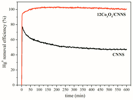 The performances of CNNS and 12Co3O4/CNNS towards elemental mercury removal at 120 °C over 600 min on 5% O2/N2 stream.