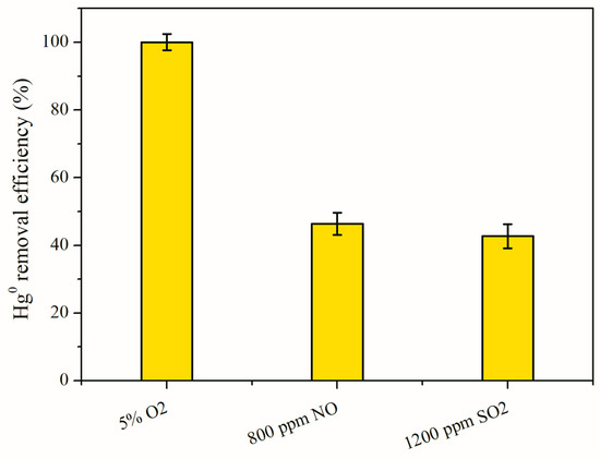 Nitrogen monoxide and sulfur dioxide are the predominant acidic gas components in coal-derived flue gas. The influences of NO and SO2 on the mercury conversion of 12Co3O4/CNNS at 120 °C is shown in Figure 11. It is found that NO and SO2 both show detrimental impacts on Hg0 removal processes. The mercury conversion of 12Co3O4/CNNS was significantly reduced to ~44.6 and ~42.7% after adding 800 ppm NO and 1200 ppm SO2 into the feed gas, respectively. This suggests that NO or SO2 molecules and Hg0 vapor could be competitively adsorbed on the surface of 12Co3O4/CNNS [9]. In addition, the adsorbed SO2 may react with Co3O4 to produce thermally-stable metal sulfates, i.e., cobalt sulfate, leading to the decline of the active phases [42]. Thus, the competitive adsorption and side reactions contribute to the remarkable suppressive influences of NO and SO2 towards Hg0 adsorption.