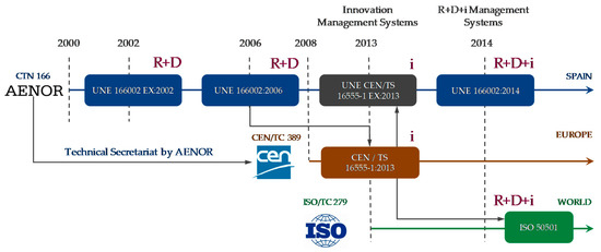 A quick inspection of Table 1 reveals that Spain has been at the forefront of innovation regulation well before other European countries. Particularly, the Spanish UNE 166.002 standard [51] provides a guide for those companies that intend to develop more effective organizational and technological innovations [48]. Furthermore, the European Committee for Standardization (CEN) is developing the 16555 family of standards at a European level (largely based on the Spanish standards). More recently, the International Organization for Standardization (ISO) has also published the 50501 standard at an international level [52] which largely based on the European standards and, in turn, in the Spanish ones too. A simplified timeline of the most relevant Spanish and International is shown in Figure 1.
