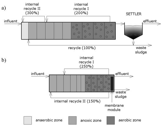 Schematic diagram of the analyzed systems: (a) conventional activated sludge process (CAS) with a secondary clarifier, (b) membrane bioreactor (MBR).