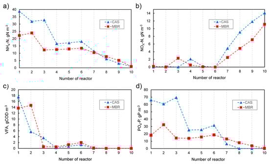 Concentration of selected parameters through individual tanks in the CAS and MBR systems. (a) Ammonia, (b) Nitrate and nitrite, (c) Volatile fatty acids, (d) Orthophosphate.