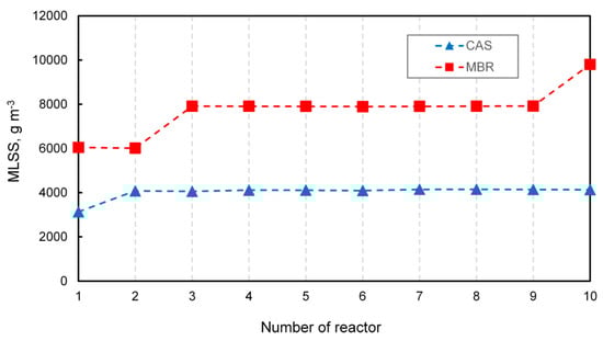Oxygen diffusion depends on the conditions prevailing in the MBR. Germain and Stephenson [40] noticed that increasing airflow led to a higher concentration of oxygen, resulting in a more efficient mixing intensity and inducing floc breakup, so that particles of various sizes were formed. Additionally, oxygen transfer decreased exponentially with increasing solids concentration. The mixed liquor suspended solids (MLSS) is considered to be a crucial operational parameter in MBR technology [41]. Figure 4 shows the concentration of MLSS in the modeled CAS and MBR systems.