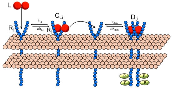 Receptor dimerization reaction scheme. Dimerization includes the following reactions for any two receptor monomers with indices i and j: ligand L binds a non-ligated receptor monomer Ri, with on-rate kLi and off-rate akLi, forming a ligand-receptor complex CLi. This complex can then dimerize with another un-ligated receptor monomer Rj, with forward rate kdim and reverse rate akdim, to form the dimer Dij. Note that i = j indicates a homodimer and i ≠ j indicates a heterodimer.