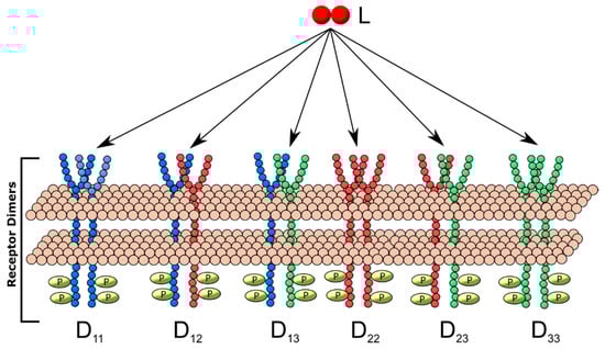 The following are available online at https://www.mdpi.com/2227-9717/7/5/288/s1, Supplementary Figure S1. Comparison of dimerization regimes at higher order; Figure S2. One receptor model. Compares fractional dimers activated by ligand A with dimers activated by ligand B across different ligand concentrations while varying the ratio of the binding constants; Figure S2. One receptor model. Compares fractional dimers activated by ligand A with dimers activated by ligand B across different ligand concentrations while varying the ratio of the binding constants; Figure S3. Two receptor model with no overlap. Compares the fractional dimers of homodimers made with receptor 1 and receptor 2, as well as heterodimers made with receptors 1–2 across different ligand concentrations while varying the ratios between the binding rates; Figure S4. Two receptor model with one overlap. Compares the fractional dimers of homodimers made with receptor 1 and receptor 2, as well as heterodimers made with receptors 1-2 across different ligand concentrations while varying the ratios between the binding rates; Figure S5. Two receptor model with two overlaps. Compares the fractional dimers of homodimers made with receptor 1 and receptor 2, as well as heterodimers made with receptors 1-2 across different ligand concentrations while varying the ratios between the binding rates; Supplementary Text 1: Model Equations; Supplementary Table S1: Generalized two, three, and four receptor models default parameter values applied; Supplementary Table S2: Generalized two, three, and four receptor model parameter variation values applied; Table S3. Two-receptor, one-ligand (2R1L) model predictions.