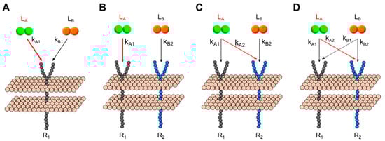 Generalized multi-ligand model schemes. (A) Two ligand, one receptor (2L1R). (B) Two ligand, two receptor, no overlap (2L2R0X). (C) Two ligand, two receptor, one overlap (2L2R1X) (D) Two ligand, two receptor, two overlaps (2L2R2X).