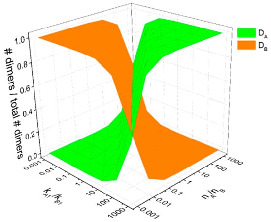 Dimerization is compared between conditions using the relative steady-state dimer, referred to here as the dimer fraction. The dimer fraction is defined Equation (1) as the ratio of the number of steady-state dimer Di molecules (ni) to the total number of all steady-state dimer molecules in the simulation.