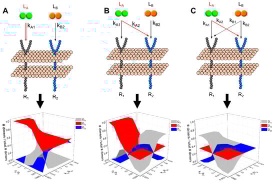 Multi-ligand, two-receptor model dimerization patterns across relative affinity-and concentration parameter spaces. (A) Two ligand, two receptor, no overlap (2L2R0X). (B) Two ligand, two receptor, one overlap (2L2R1X) (C) Two ligand, two receptor, two overlaps (2L2R2X).