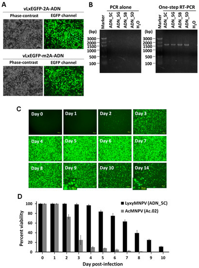 The plasmids, pLxEGFP-2A-ADN and pLxEGFP-m2A-ADN, were transfected into NTU-LY cells (1 μg of plasmid DNA was transfected into 3 × 105 cells per well in Nunc™ 4-Well Dishes) using Cellfectin reagent (Invitrogen, California, USA) in accordance with the manufacturer’s protocol. After gentle shaking at room temperature for 5 h, the transfection mixture was removed and replaced with fresh TNM-FH medium. Then, the cells were inoculated with wt-LyxyMNPV at a multiplicity of infection (MOI) of 10 and incubated at 28 °C. Monitoring was done for 7 d posttransfection to ascertain successful expression of the recombinant virus via the green fluorescent plaques observed by fluorescence microscopy (Olympus IX71). The recombinant virus was subsequently purified by three rounds of plaque screening following the protocols described by Summer and Smith (Summers and Smith 1987). The resulting viruses were named vLxEGFP-2A-ADN and vLxEGFP-m2A-ADN. The virus titer was measured using the end-point dilution method (TCID50 analysis) (Reed and Muench 1938) by EGFP fluorescence detection in a 96-well plate. For RT-PCR analysis, two clones of each recombinant virus were picked from the 96-well plate at a dilution of 10−5 and designated vLxEGFP-2A-ADN_5C, vLxEGFP-2A-ADN_5G, vLxEGFP-m2A-ADN_5B, and vLxEGFP-m2A-ADN_5D. NTU-LY cells were infected with four recombinant clones at an MOI of 1 and incubated at 28 ˚C. Total RNA was extracted from the infected cells at 72 h post-infection (p.i.) using Trizol reagent (Invitrogen, California, USA) in accordance with the manufacturer’s protocol. A portion of the total RNA sample (2 μg) was treated with DNase I (1 unit) in a 10 μl reaction containing 1×DNase I reaction buffer at 37 ˚C for 30 min, and the reaction was stopped by adding 1 μl of 25 mM EDTA solution, followed by heating the mixture at 75 °C for 15 min. Mock DNase I-treated samples were prepared and processed in parallel by replacing DNase I with water. One hundred nanograms of DNase I-treated or mock-treated total RNA was used in either one-step RT-PCR or PCR alone (without RT treatment) using the primers GFP-forward and SacII/His-ADN_R. The resulting RT-PCR products were then purified and analyzed by DNA sequencing. For cell viability analysis, NTU-LY cells were infected with vLxEGFP-2A-ADN at an MOI of 5 in triplicate. On days 0–10 post-infection, the percentage of viable cells was determined by trypan blue (Thermo Fisher Scientific, USA) staining.