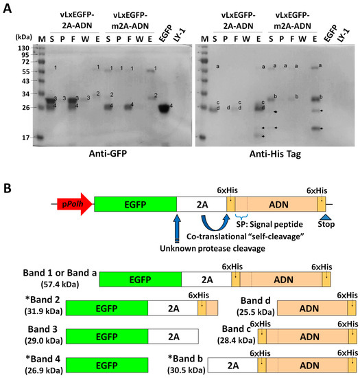As Figure 4 shows, the 2A function in the expression system was verified by Western blotting with anti-GFP and anti-His Tagged protein antibodies. Specifically, the blots for vLxEGFP-2A-ADN contained EGFP (Band 4), the EGFP-2A fragment (Band 3), and ADN fragments (Band c and d), indicating that vLxEGFP-2A-ADN has a functional 2A peptide that mediated an effective cleavage between 2A and ADN. By contrast, the blots for vLxEGFP-m2A-ADN contained EGFP (Band 4), EGFP-2A-ADN fragments (Band 1 or a, and Band 2), and 2A-ADN fragment (Band b), indicating that vLxEGFP-m2A-ADN has a nonfunctional 2A peptide (Figure 4A). The molecular weights of these bands shown in parenthesis were calculated according to their amino acid sequences. Bands 1, 2, 3, 4 and a, b, c, d can be recognized by anti-GFP or anti-His antibodies, due to the fact that they contain an EGFP protein and/or C-terminal His-tag. Based on the design, the expected products should be band 1 or band a, band 3, band c, and band d, while band 2, band 4, and band b are putative products (Figure 4B). The protease cleavage-generated EGFP protein (Band 4) in both soluble and flow-through fractions is shown in blots detected with anti-GFP antibodies. Notably, the major purified protein, ADN-His (Band d), for vLxEGFP-2A-ADN was slightly smaller than the fragment of His–ADN-His (Band c), suggesting the possibility that the recombinant ADN produced by NTU-LY cells may undergo signal peptide removal. Based on our investigations, a signal peptide predicted at the N-terminal sequence of full-length ADN using SignalP 4.0 website software [19] and a matched molecular weight of protein found in culture medium (see below) could partially support the suggestion. However, more evidence needs to be provided for proof of this speculation (e.g., mass spectrum sequencing data). Several low-molecular bands (Figure 4A, arrowheads) that supposedly resulted from protein degradation were also observed in blots, while the identities of these bands were beyond the scope of this paper.