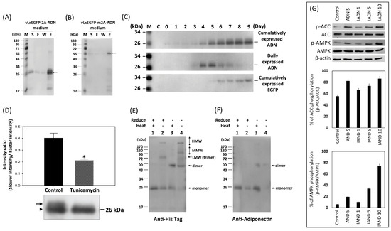 Demonstration of porcine adiponectin (ADN) and EGFP expression by EGFP-2A-based expression system. (A–C) Purification of recombinant proteins from culture medium. The medium obtained from NTU-LY cultures infected with the recombinant virus vLxEGFP-2A-ADN (A) or vLxEGFP-m2A-ADN (B). The major bands representing the purified recombinant proteins in elution fractions are indicated by arrows. (C) Time-course of protein expression in the culture medium. S = supernatant; F = sample from fraction; W = sample from washed solution; E = eluted sample; C = medium collected from uninfected cultures for the negative control; M= protein marker; * = significant difference. (D) Glycosylation of recombinant proteins in culture medium. Arrow indicates glycosylated band (slower migrating band), and arrow head indicates non-glycosylated band (faster band). Glycosylated band was decreased more than non-glycosylated band by tunicamycin treatment. (E, F) Multimer separation patterns of ADN expressed in NTU-LY cells by SDS-PAGE under various conditions. Each lane was denoted with “+” (including reducing reagents in sample buffer or heat treatment) or “-” (not including reducing reagents in sample buffer or not heat treatment). HMW= high molecular weight; MMW = middle molecular weight; LMW = low molecular weight. (G) Effect of recombinant porcine adiponectin on the phosphorylation of acetyl-CoA carboxylase (ACC) and AMP-activated protein kinase (AMPK). Control = cells treated with phosphate buffered saline (PBS, pH 7.4); ADN 5 = cells treated with human recombinant ADN (5 μg·ml−1) for positive control; IADN 1, 5, and 10 = cells treated with insect-expressed porcine recombinant ADN (1, 5, and 10 μg·ml−1, respectively).
