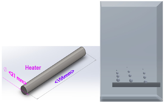 The boiling process occurs when the temperature of the solid surface to which the liquid contacts exceeds the saturation temperature corresponding to the pressure of the liquid. Boiling process is described visually in Figure 1. In Figure 1, the pipe diameter and length are 21 mm and 105 mm, respectively. The experimental heat flow is about 10–80 kW/m. Four different materials, copper, brass, aluminum, and steel, are used as heater surface. The surface roughness is 30–360 mm and the conditions are atmospheric pressure. The vessel of the boiling volume is 0.003 m. Water and ethanol were used for a boiling liquid. As seen in Figure 1, the first bubble was boiled in the boiling core in the isolated bubble regime. However, the bubble did not reach the free surface. In an isolated bubble regime, the boiling core was analyzed for boiling the pool on a horizontal tube heater [20].
