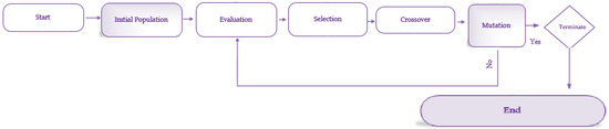 Genetic Algorithm is the first and most known of the evolutionary calculation algorithms. To understand the terminology of the genetic algorithm (GA), it is necessary to understand natural selection. When observing the world, natural selection comes to the fore in events. The enormous organisms and complexity of these organisms are the subject of investigation and research. It can be questioned why organisms are like this and how they come to this stage. The level of adaptation and suitability has become a sign of long-term survival in the world. The process of evolution is a great algorithm that allows the most appropriate life conditions. If an organism has the intelligence and ability to change the environment, the global maximum can be achieved in life [34]. This algorithm externalizes the process of natural selection in which pertinent individuals are selected for reproduction to produce progeny of the next generation. General flow chart of the genetic algorithm is given in Figure 2.