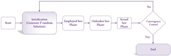 ABC algorithm is the modeling of bees food search mechanisms. The bees live in colonies. The bees colony includes three groups of bees: onlookers, scouts, and employed bees. Some of the colony consists of employed artificial bees and the others contain onlookers. For each food source, there is solely an employed bee [35,36]. Figure 3 shows the main steps for the ABC algorithm. In this study, the ABC algorithm and the GA algorithm were used with the same mathematical model and bounds; however, their configurations were different. Both algorithm configurations are shown in Table 2.