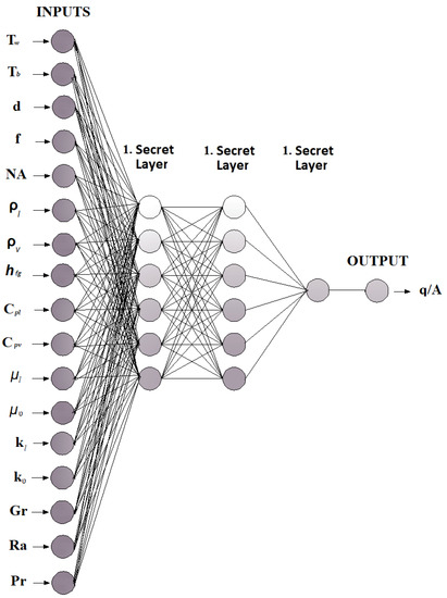 Pool boiling processes are important heat transfer mechanisms in many engineering applications [1], especially in chemistry, mechanical engineering processes, refrigeration, gas separation, etc. [2]. The formation and removal of vapor bubbles from the solid–liquid interface can be explained by boiling. In the literature, boiling heat transfer studies can be divided into two groups: (1) flow boiling; and (2) pool boiling [3,4]. Boiling allows the transfer of large amounts of heat energy at low-temperature differences. The boiling event has a wide range of applications. The major areas of application include nuclear power plants, rocket motors, refrigeration industry, boilers, steam power units, process industry, and evaporators. Although many investigations are reported on the boiling mechanism, the physical mechanism of boiling has not yet been fully elucidated, even in the case of running water [5]. Many investigators have improved correlation for calculating boiling heat flux [6]. These correlations are calculated for nucleate pool boiling heat flux to nearly 50% error [7,8,9,10]. Nowadays, many investigators study optimization and ANN for heat transfer prediction [11,12,13,14]. Das and Kishor studied the heat transfer coefficient in pool boiling of distilled water. They compared the results of the zero-order adaptive fuzzy model and adaptive neuro-fuzzy inference system (ANFIS function) [15]. Swain and Das used the computational intelligence methods for the flow boiling heat transfer coefficient [16]. Barroso-Maldonado et al. studied cryogenic forced boiling. They compared ANN to three conventional correlations [17].To calculate heat transfer in fluids, some researchers have developed models using computational fluid dynamics [18,19].