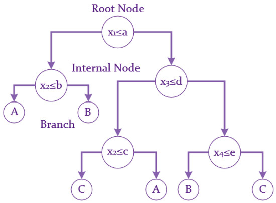 The test dataset is used to determine the generalization capability of the generated tree for a new dataset. A test data coming from the root of the tree enters the tree structure created with the training dataset. This new data tested in the root is sent to a lower node according to the test result. This process is continued until it reaches a specific leaf of the tree. There is only one way or a single decision rule from root to every leaf [46]. The working principle of the decision tree method, which is a computational intelligence method, is simply shown in Figure 6. Figure 6 shows a simple tree structure consisting of four-dimensional attribute values of three classes. In the Figure 6, the xi parameter shows the values of the attribute. The parameters a, b, c, and d show the threshold values in tree branches. Parameters A, B, and C show the class label values [47].