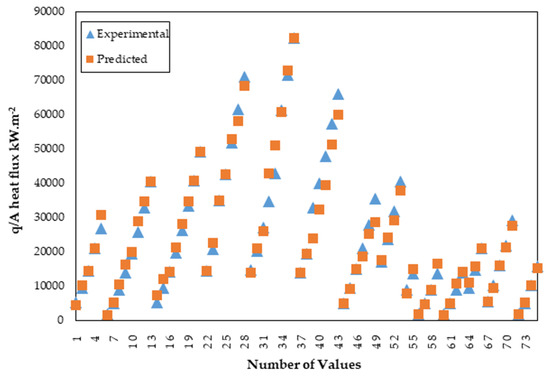 As input data for the all regression analysis model, the following were used: (1) ; (2) ; (3) d; (4) NA; (5) f; (6) ; (7) ; (8) ; (9) ; (10) ; (11) ; (12) ; (13) ; (14) ; (15) Gr; (16) Prandtl; and (17) Ra roughness values. Boiling heat flux (q/A) was used as output data.
