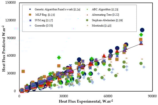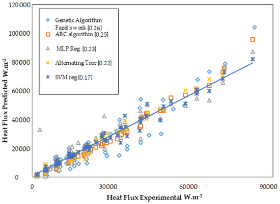 Instant heat flux has to be estimated in pool boiling. This requirement is mainly for determining the boiling heat transfer coefficient. Figure 9 depicts the results of the well-known correlations and computational intelligence techniques used in the study. It is clearly seen that the computational intelligence techniques performed better than the correlations developed. Especially, SVMReg predicted q/A error rate with a MAPE nearby 0.17. This error rate was the minimum value presented in this study. In this analysis, some parameters were obtained as a result of experiments. The other parameters were obtained from EES. However, they could make better predictions than the many correlations used today for the development of data. In the near future, computational intelligence techniques can be used more in predicting the heat transfer of boiling phenomena. Some researchers supported this view in their works [49,50,51].