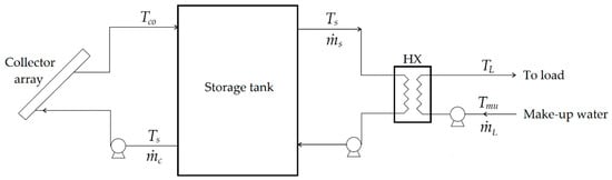 The equation that describes the energy balance in the storage tank is given by [28] (pp. 426–444):