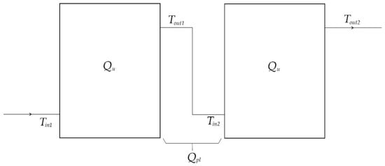 On the other hand, the thermal performance of a collector field not only depends on the individual efficiency of each collector, but it also depends on how these are interconnected. In the thermal analysis, a collector connected in series must consider interconnection heat losses. The useful heat of two or more solar collectors connected in series is determined by the energy gain in each collector along to the heat losses in the interconnection pipes [29], as shown in Figure 2. As a result, the temperature at the outlet of the first collector, , is greater than the temperature at the entrance of the second collector, , due to the heat losses, , of the interconnection pipe.