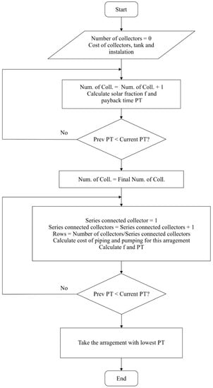 - Analyze different serial–parallel arrays keeping the number of collectors determined in the previous step, with the objective of optimizing the payback time without affecting the solar collection area. Iterations are performed varying the number of collectors in series and their corresponding number of rows. In each iteration (corresponding to a specific array) the following steps are carried out: