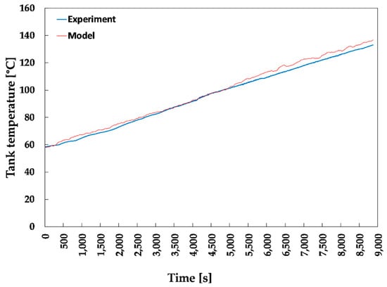 The model was validated based on the data reported in Venegas-Reyes [33], where five collectors were connected in series and coupled to a storage tank of 120 L. The system was pressurized to avoid water’s phase change. The test was performed circulating water from the storage tank to the collectors and returning it to the tank, accumulating the heat. In this way, it was possible to increase the water temperature from an initial value of 58.4 °C to a final value of 132.9 °C. Figure 4 shows the water temperature in the storage tank for both experimental data and model. The experimental values of temperature and the values obtained with the model show an average relative error of 2.16%.