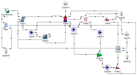 The system in Figure 1 was implemented in a TRNSYS workspace, as shown in Figure 5. The collector field (Type 71) is connected to the storage tank modeled with the Type 4a, this is a stratified tank where a single node is being considered to emulate a fully mixed tank, this is connected to the heat exchanger (Type 91) in the load side, with a known effectiveness (e.g., of a technical sheet). There are four pumps: the Type3b pump supplies water to the collectors and to the hot side of the storage tank. The Type3b-2 pumps the fluid from the storage tank to the heat exchanger, Type3b-3 pumps the make-up fluid from the thermal load. An auxiliary heater (Type 6) and a Type3b-4 pump with a Type6-2 heater emulate a conventional heating system.