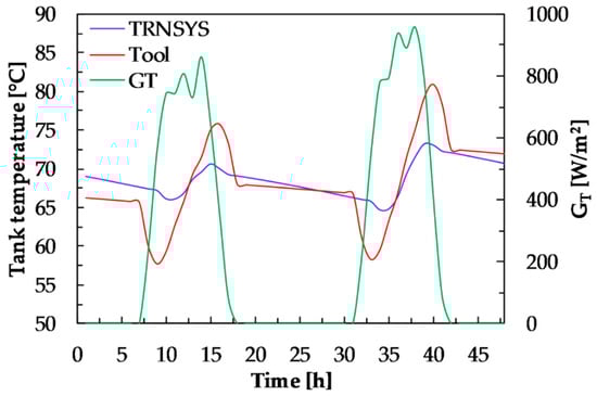 Figure 6 shows the temperature profiles of the water in the storage tank, calculated with the proposed tool (Equation (2)) and with the TRNSYS model, every hour of the period from 31 January (hours 1–24) to 1 February (hours 25–48). It is observed that the thermal performance of the tank calculated with the proposed tool is sensitive to solar radiation. During the first hour of heat extraction to the process (from 7–8 h, and from 31–32 h), it presents a temperature decrease of 9 °C, and this is due to the fact that heat is extracted when the minimum solar radiation value required to gain heat from the solar collectors has not yet been reached. Similar behavior occurs when the heat extraction ends (17 h, and 41 h), since there is no solar radiation available, the temperature decreases dramatically during the following hour, around 8 °C. In contrast, the results obtained with the TRNSYS model are more stable, because the pumping to the tank is being controlled with regard to the critical level of radiation. As for the period between 18 h and 31 h, when there is no solar radiation, the behavior calculated with both tools is quite similar.
