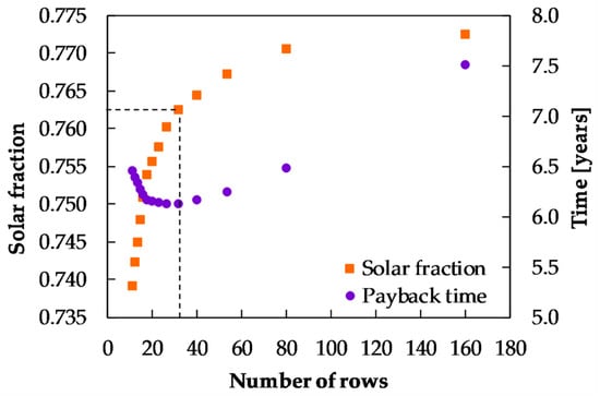 Figure 11 shows the payback time according to the number of rows, which is a function of the number of collectors in series and the corresponding solar fraction. It is shown that the optimal array based on the technical-economic analysis, results in 32 parallel rows of 5 collectors in series each; which give the shortest payback time of 6.13 years and a solar fraction of 0.763. In other words, there is a maximum number of solar collectors that should be connected in series and a corresponding number of rows.